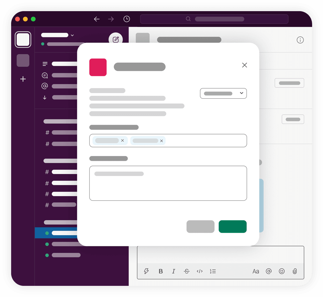 Modals appear in front of any other interface element in Slack. As a result, they are short-lived and invoked only when a specific task is to be completed. Apps can only create modals in response to user invocation, such as a shortcut.